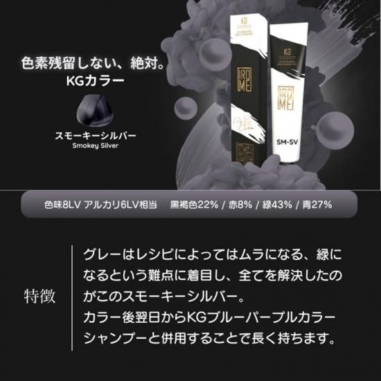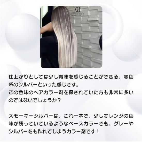 【透明感のある輝くシルバー】 グレーはレシピによってはムラになる、緑になるという難点に着目し、全てを解決したのがこのスモーキーシルバー。 カラー後翌日からKGブルーパープルシャンプーと併用することで長く持ちます。