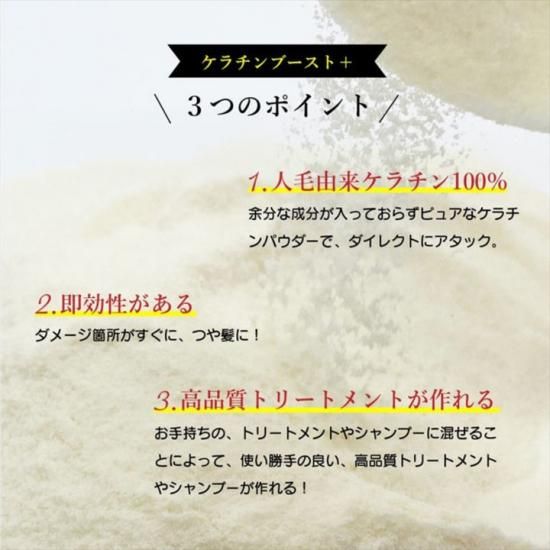1.人毛由来ケラチン100% 余分な成分が入っておらずピュアなケラチンパウダーで、ダイレクトにアタック。 2.即効性がある・ダメージ箇所がすぐにつや髪に! 3.高品質トリートメントが作れる・お手持ちのトリートメントやシャンプーに混ぜることによって、使い勝手の良い高品質トリートメントやシャンプーが作れる。
