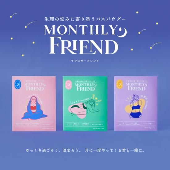 ゆっくり過ごそう、温まろう。月に一度やってくる君と一緒に。身体の冷え、肌荒れ、イライラ。そんな生理中のさまざまな悩みに寄り添う乳白色のバスパウダー「MONTHLY FRIEND」。香りと成分違いの3種類をご用意しています。それぞれの悩みや必要な日数に応じてお気軽にご利用いただけます。 生理中のさまざまな悩みにあわせた3種類の湯色と香りで、心と体をいたわりましょう。 “イライラ”には、リラックスするカミツレ葉・シャクヤクエキス配合の「ゼラニウムの香り」ソフトグリーンの湯色。
