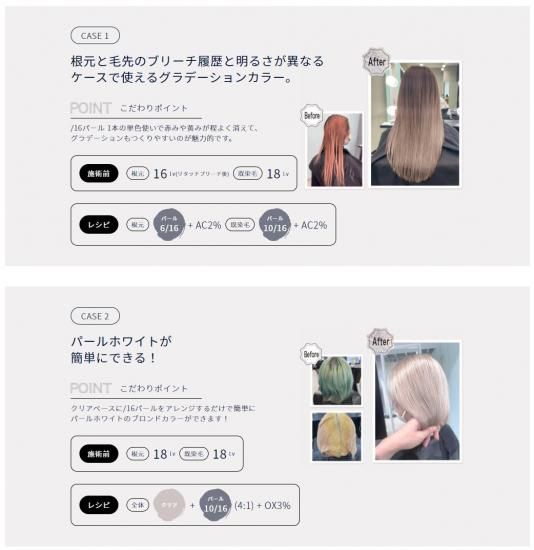 大注目の「とろみカラー」を1本で表現する新色やわらか/16(パール) ブリーチオンカラーに必要なアンダーカラーのコントロール『補色』と『褪色過程』(残留)までが計算されたレシピを1本に。シア―な艶とやわらかい質感を表現するパール。今のトレンドであるとろみある質感を表現するハイトーンカラー。そのなかでも、人気が高く寒色によりすぎない、パールのようなシア―なツヤとやわらかい質感を表現できます。万能で使いやすく多くの人に似合う鉄板カラーです。
