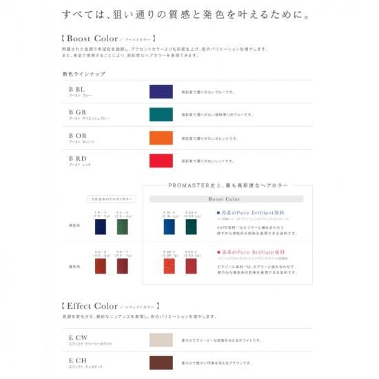 すべては、狙い通りの質感と発色を叶えるために。 【Boost Color / ブーストカラー】鮮麗された色調で希望色を強調し、アクセントカラーよりも彩度を上げ、色のバリエーションを増やします。また、単品で使用することにより、高彩度なヘアカラーを表現できます。 PROMASTER史上、最も高彩度なヘアカラー 高彩度で濁りがないブルーです。